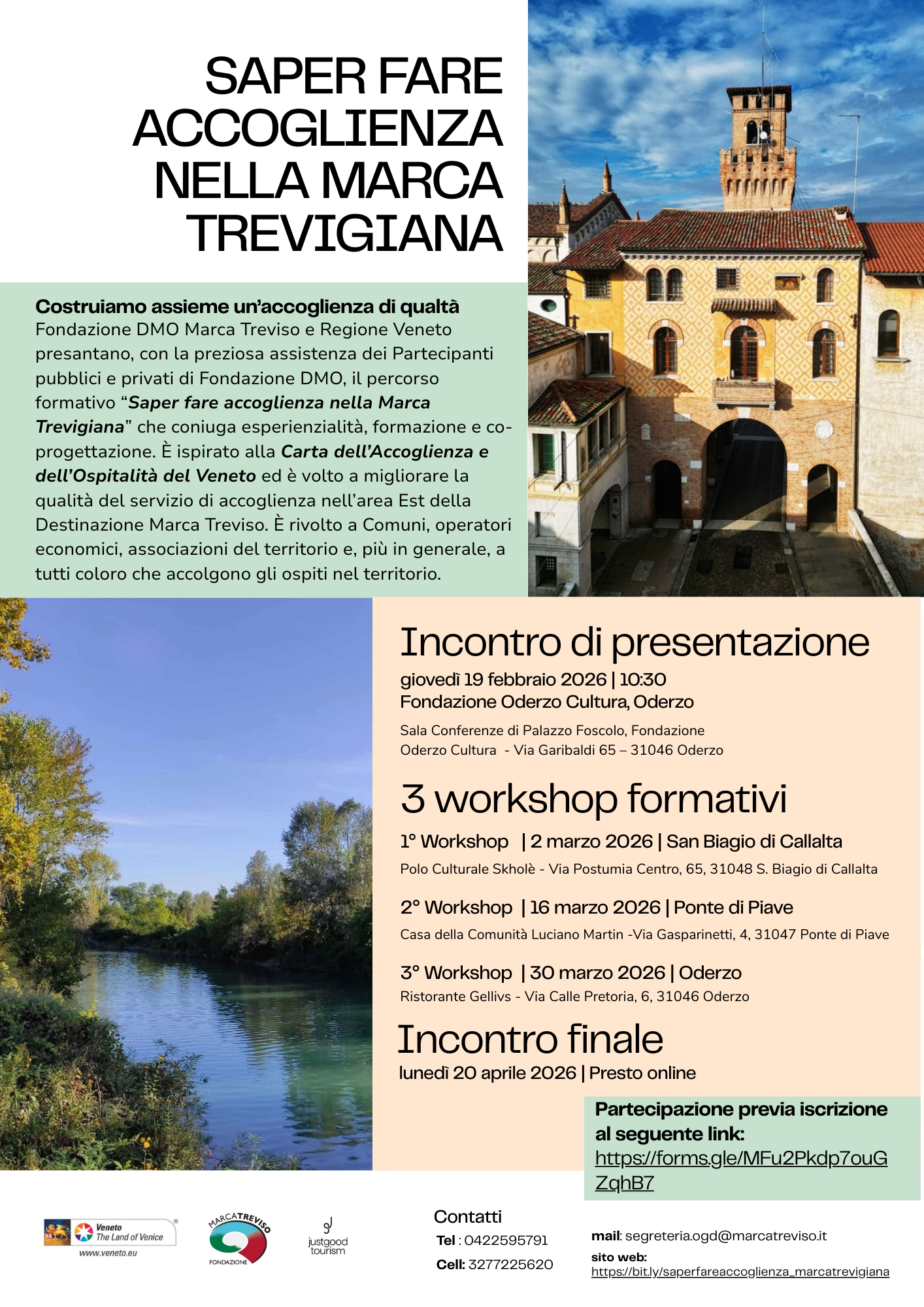 Il progetto è promosso da Fondazione DMO Marca Treviso, in partnership con Regione del Veneto, realizzato con Just Good Tourism e con la preziosa collaborazione dei Partecipanti pubblici e privati di Fondazione DMO. E' rivolto a Comuni, operatori economici, associazioni del territorio e, più in generale, a tutti coloro che accolgono ospiti nel territorio, ed ha l’obiettivo è consolidare un modello diffuso di accoglienza, in coerenza con la Carta dell’Accoglienza e dell’Ospitalità del Veneto e con le priorità del Piano Strategico DMO 2025–2027, traducendo i valori della Carta in azioni operative e replicabili. Il percorso prevede momenti informativi e workshop di co-progettazione rivolti alle realtà che accolgono visitatori nell’area Est della Destinazione Marca Treviso.